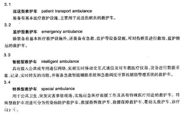國家質(zhì)量監(jiān)督檢驗檢疫總局發(fā)布的GB/T 17350-2009《專用汽車和專用掛車術(shù)語、代號和編制方法》、工信部2014年3月1日實施的QC/T 457-2013《救護車》、衛(wèi)生部2008年4月1日實施的WS/T 292-2008《救護車》,都對救護車有著各自的定義。