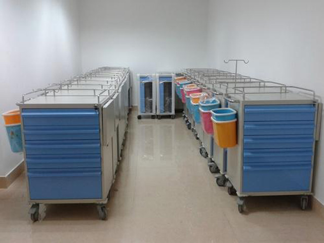 搶救車的基本構(gòu)造是車體、輪子、還有醫(yī)用櫥柜。櫥柜的柜體是放藥品的空格。車體有固定氧氣瓶的套筒。還配有輸液架,還有多個放物品的抽屜。蓋板可以蓋住藥物。采用了塑鋼材料,包含工作臺面,雜物箱,輸液架,輪子,垃圾桶。一般分四個層次,急救藥品區(qū),放置一定數(shù)量的急救藥品,根據(jù)藥品使用頻率來依次排列。輸液區(qū),放了輸液器、注冊器、留置針、止血貼、消毒棉、砂輪、等。呼吸物品區(qū),開口器、壓舌板、吸氧管、各種型號插管喉鏡。其他物品,溫度計、血壓計、電筒、負壓吸引器等。