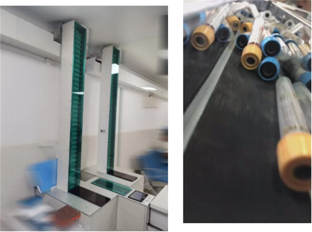 采血試管自動化傳輸平穩(wěn)準(zhǔn)確的傳到各個位置,前段的試管跟貼標(biāo)機(jī)系統(tǒng)和后端分揀機(jī)的系統(tǒng)實現(xiàn)對接。