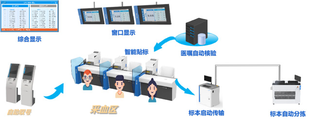 采血流程:患者到窗口采血-掃碼或讀就診卡-核對(duì)檢驗(yàn)項(xiàng)目-打印標(biāo)簽-選擇試管-粘貼試管-護(hù)士采血。人工采血存在問(wèn)題人工選管、打印、粘貼,勞動(dòng)強(qiáng)度大。容易出現(xiàn)人為錯(cuò)誤。貼歪、貼倒(不能識(shí)別)。位置錯(cuò)誤(流水線無(wú)法識(shí)別)。視窗覆蓋(無(wú)法觀察血液情況)。可能出現(xiàn)漏采或多采血。智能采血設(shè)備解決采血人的排隊(duì)難題,智能采血管理系統(tǒng)把采血管的準(zhǔn)備工作自動(dòng)化,縮短等待時(shí)間。采血流程需要全面的優(yōu)化,報(bào)到取號(hào),65歲以上老人優(yōu)先。智能叫號(hào)不需要長(zhǎng)時(shí)間的排隊(duì)。采血管容量大,處理速度快,能有效加快采血速度,提高采血服務(wù)質(zhì)量。自動(dòng)化代替了傳統(tǒng)人工的操作模式。自動(dòng)識(shí)別自動(dòng)貼標(biāo),自動(dòng)標(biāo)本核收。大大的減少人工誤差。也減少繁雜的采血前準(zhǔn)備,系統(tǒng)具有諸多優(yōu)勢(shì),將為客戶帶來(lái)全新的體檢體驗(yàn)。