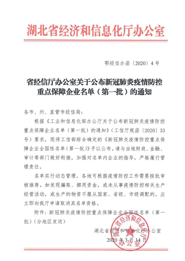 湖北省顯浩裝備科技有限公司被省經(jīng)濟(jì)和信息化廳列入新冠肺炎疫情防控全國重點保障企業(yè)(第一批)名單。