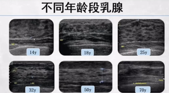 不同年齡段乳腺的超聲表現(xiàn),隨著年齡增長(zhǎng)而異。取決于內(nèi)部的脂肪纖維和腺體組織的多少。