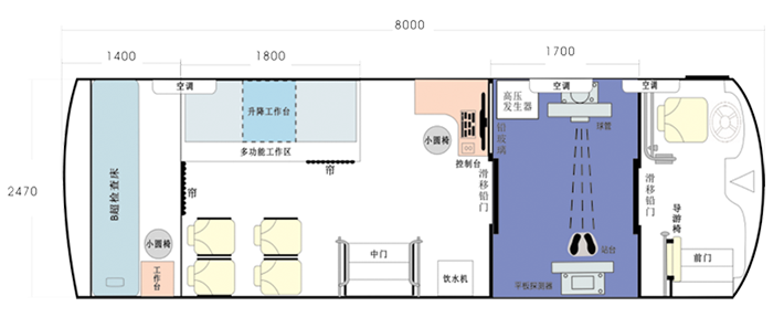 車載DR體檢車功能卻很齊全,車上配裝X光機(jī)、心電超聲檢查、電測聽室、全自動生化分析儀以及檢查床、冰柜、空調(diào)和紫外線消毒燈等先進(jìn)醫(yī)療儀器設(shè)備。